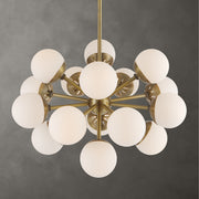 Designed With Mid-Century Roots A Sputnik Center Structure Finished In A Warm Antique Brass And Accented With 5" Matte White Opal Globes Yields A Modern Take On Vintage Style. 16-60 Watt Max G16.5 Candelabra Sockets. Bulbs Not Included. Supplied With 15' Wire, 3-12" Stems And 1-6" Stem For Adjustable Installation.