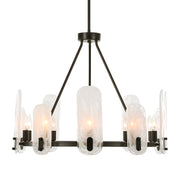 We Started With A Traditional Ring In Dark Bronze Then We Added Playful Alternating Heights Of Oval White Swirl Glass Held In Place With Dark Bronze Binders Giving Us A Wonderful Classic Chandelier. 10-60 Watt Max Candelabra Sockets. Bulbs Not Included. Supplied With 15' Wire, 3-12" Stems And 1-6" Stem For Adjustable Installation.
