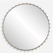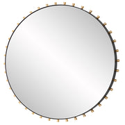 This Modern Round Mirror Features A Iron Frame Finished In Matte Black, Adorned With Brass Plated Tapered Round Pegs Surrounding A Floating Polished Edged Mirror.