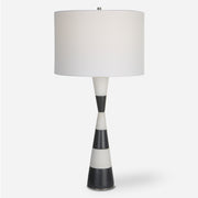 The Bandeau Lamp Is Crafted From A Banded Black And White Man-made Stone That Accentuates Its Hourglass Shape And Accurately Replicates The Look Of Thassos Marble. Iron Details Are Finished In Polished Nickel. Paired With A White Linen Fabric Drum Shade.