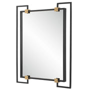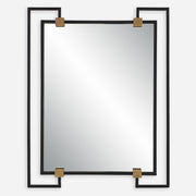 This Mirror Pairs Contemporary Styling With Industrial Details Featuring A Black Iron Frame Accented By Lightly Antiqued Brushed Gold Clamps. May Be Hung Horizontal Or Vertical.
