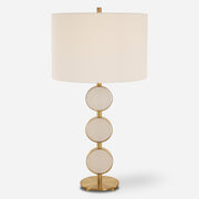 This Table Lamp Brings A Soft Contemporary Flair To Any Room By Featuring Three Suspended Alabaster Disk Surrounded By A Sleek Metal Base Finished In A Plated Brushed Brass. The Round Hardback Shade Is Covered In A Crisp White Linen Fabric.